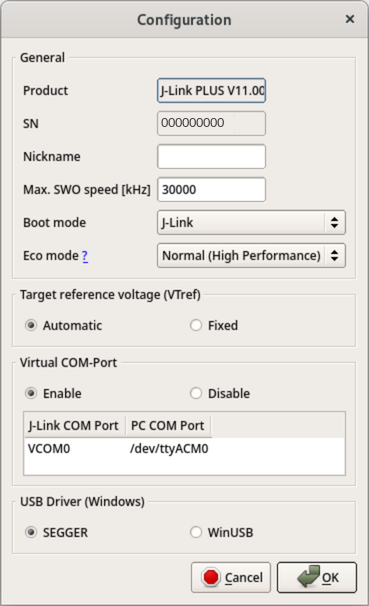 Additionally, some Segger J-Link debug probes feature VCOM and re-route a serial console through J-Link TX (pin 5) and J-Link RX (pin 17).